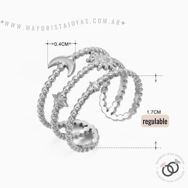 anillo triple luna,sol y etrella. diametro: 1.7cm. regulable